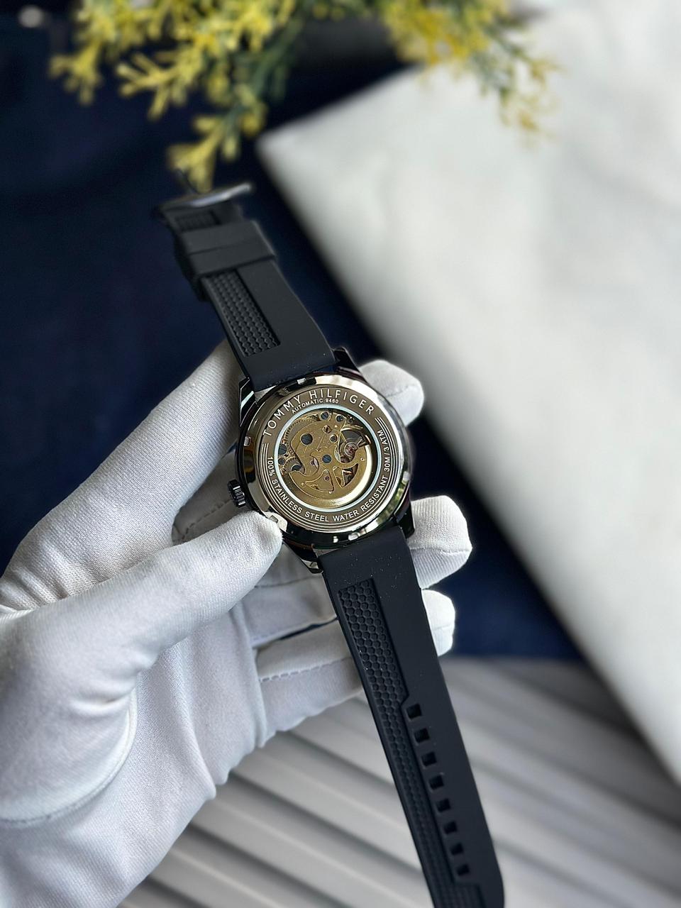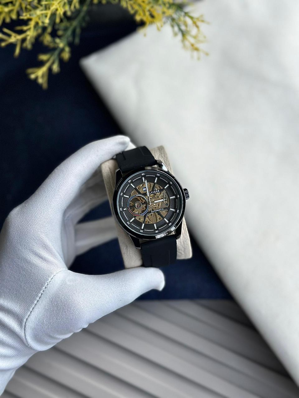 This is a stylish automatic skeleton men’s wristwatch featuring a modern open-heart dial and a durable black silicone/rubber strap. The partially transparent dial allows you to see the mechanical movement in action, giving the watch a premium and sporty-luxury appeal. Designed for men who prefer bold, modern watches suitable for daily wear as well as casual outings.