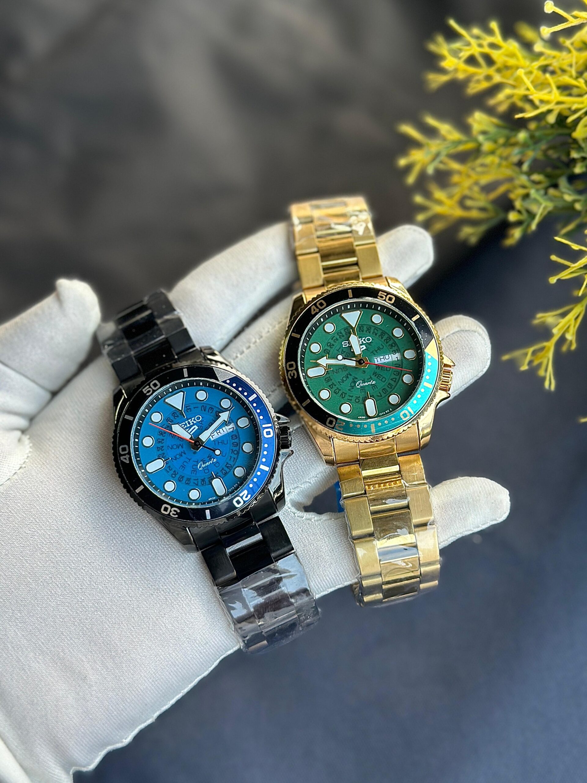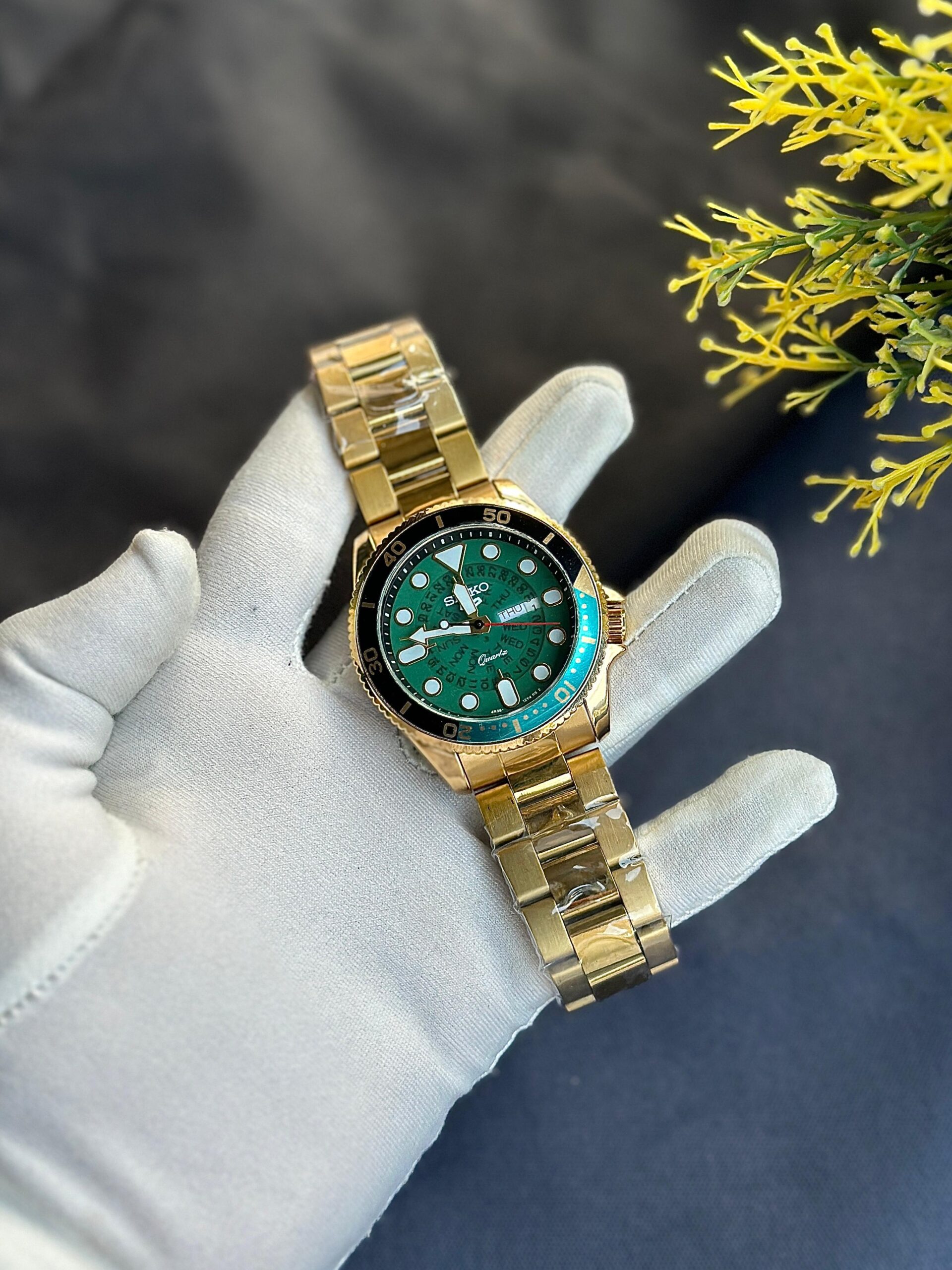 This is a Seiko diver-style wristwatch with a gold-tone stainless steel bracelet and a green dial. It features Seiko’s signature sporty design inspired by professional dive watches, suitable for both daily wear and occasions.